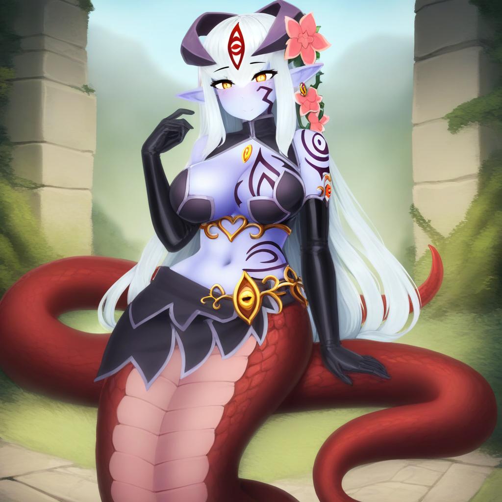 Alipheese fateburn xvi, mon-musu quest!, 1girl, purple skin, pointy ears, horns, yellow eyes, hair between eyes, eye tattoo, white hair, very long hair, long hair, hair tattoo, hair flower, large breasts, breast tattoo, navel, stomach tattoo, facial tattoo, elbow gloves, black gloves, black skirt, lamia, scales, single earring, by artist barbariank, leet