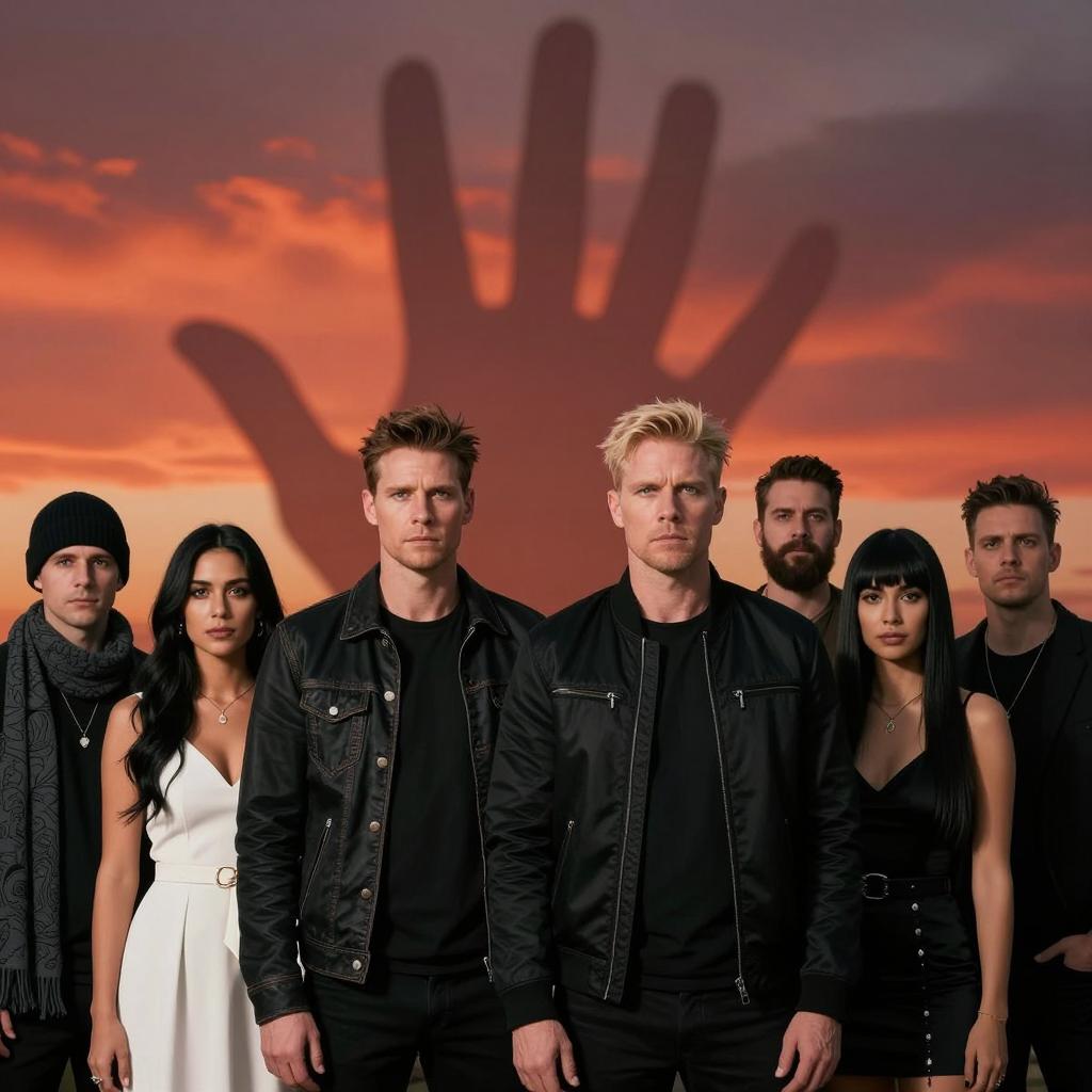 Group photo of seven people against a vibrant red-orange sunset sky. Central figures: two men with serious expressions, one with short brown hair, the other with short blond hair, both in black jackets. Flanking them: woman with long black hair and white dress, man in black beanie and scarf, woman with long black hair and black dress, man with beard and black shirt, woman with long black hair and black top, man with short dark hair and black shirt. Group stands in front of large, out-of-focus hand-shaped silhouette.