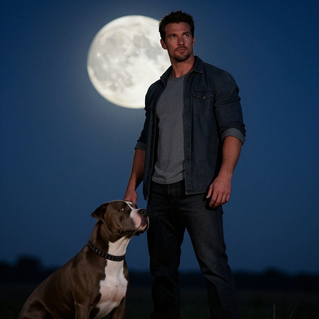 Serene night scene: A strong, athletic man, dressed in casual attire, proudly stands beneath the radiant full moon, his rugged features illuminated by its soft beams. Beside him, his faithful pitbull companion, with a calm demeanor, gazes up at their master, both bathed in the ethereal light of the lunar glow. The landscape Man has masculine face and piercing eyes