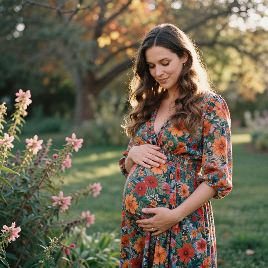 Pregnant Woman in Satin Dress with Halloween Pumpkins