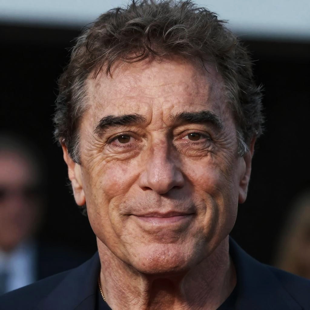 Photograph of a middle-aged man with dark, wavy hair, pale skin, and intense brown eyes, wearing a gray scarf, against a black