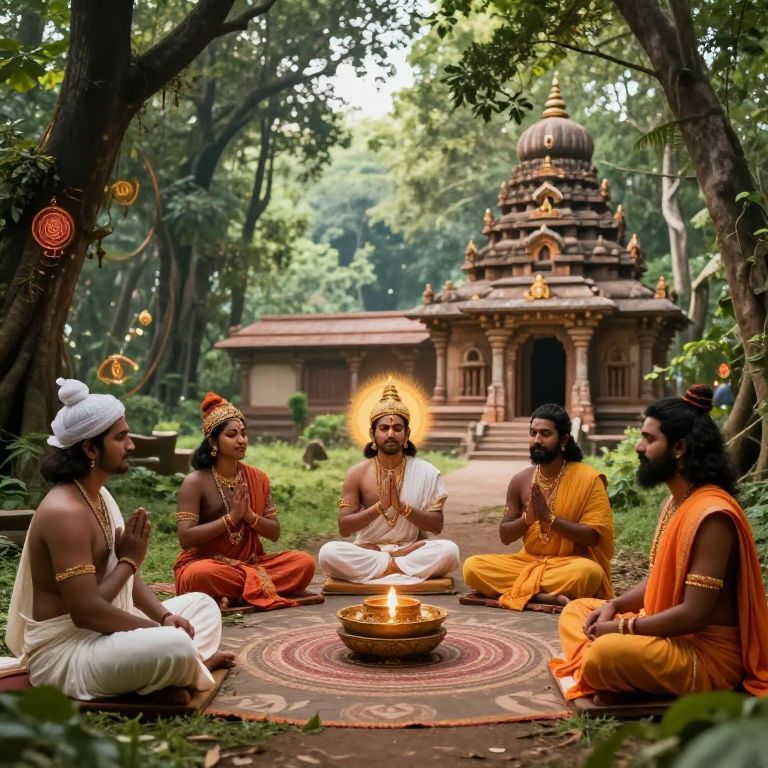 Photograph of five Indian men, in traditional attire, meditating around a lit brass oil lamp on a circular, patterned mat in a forest clearing. They wear white, orange, and yellow dhotis, with headgear and gold jewelry. The central man, with a glowing halo, sits in a white dhoti, symbolizing a deity. Behind them, an ancient, intricately carved temple with a dome and steps stands amidst lush greenery. The scene is bathed in natural light, with soft sunlight filtering through the trees, creating a serene, sacred atmosphere.