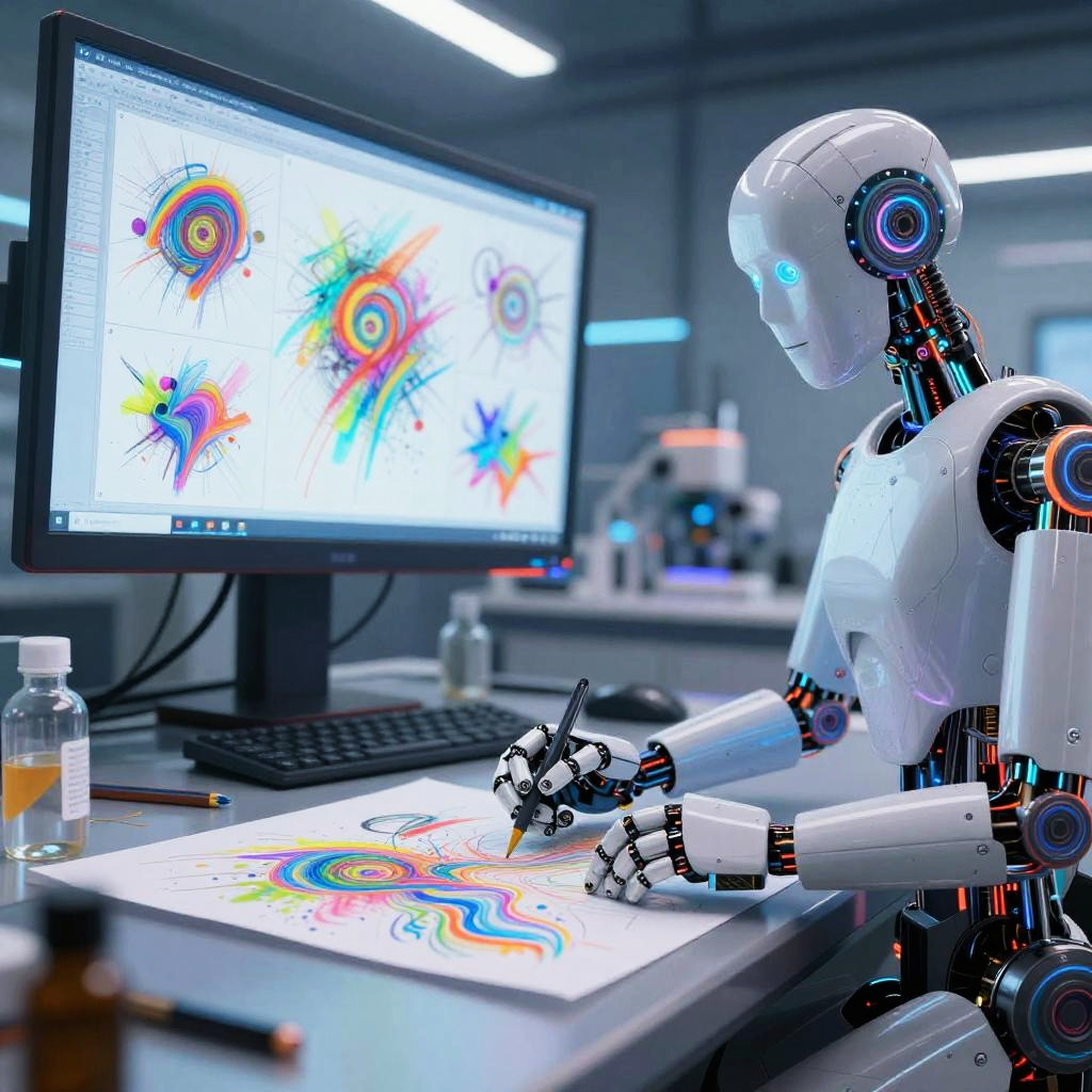 AI that can draw pictures in a futuristic laboratory, digital art flowing from robotic hands, illuminated screens displaying colorful sketches, a seamless blend of technology and creativity, vibrant neon hues and dynamic brush strokes.