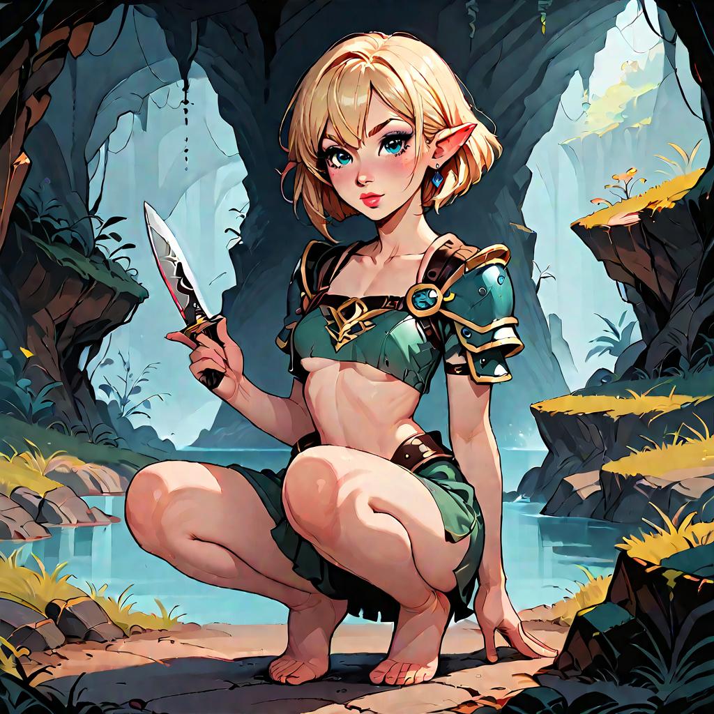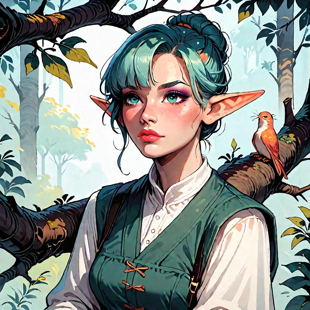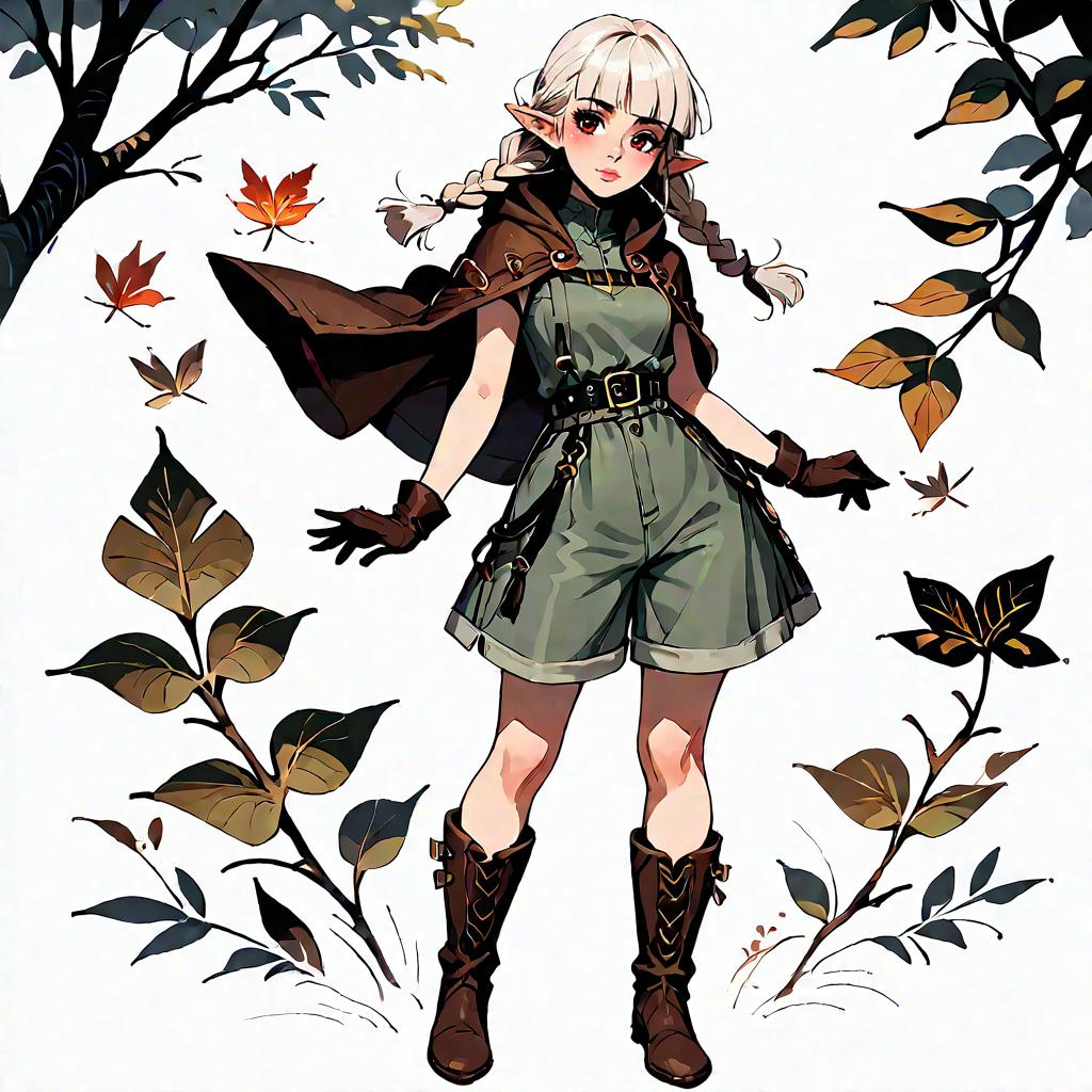 Score_9, score_8_up, score_7_up, score_6_up, source_anime, solo, 1girl, thin, petite, pose, looking at viewer, full body, light blush, white hair, brown eyes, twin braids, hime cut, pointy ears, small breasts, bare arms, wide hips, brown hoodie, brown cape, green dress, brown shorts, leather belt, leather gloves, leather long boots, leaf, tree trunk, simple background, white background