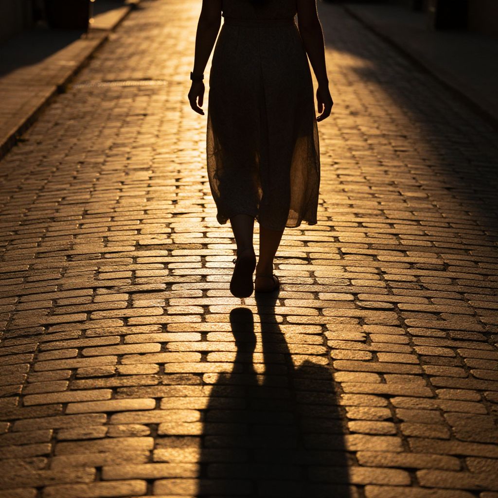 Sunset bathes a cobblestone street in golden hues as a woman in a flowing dress walks away, her silhouette casting intricate shadows that dance across the pavement, evoking a serene yet enigmatic atmosphere.