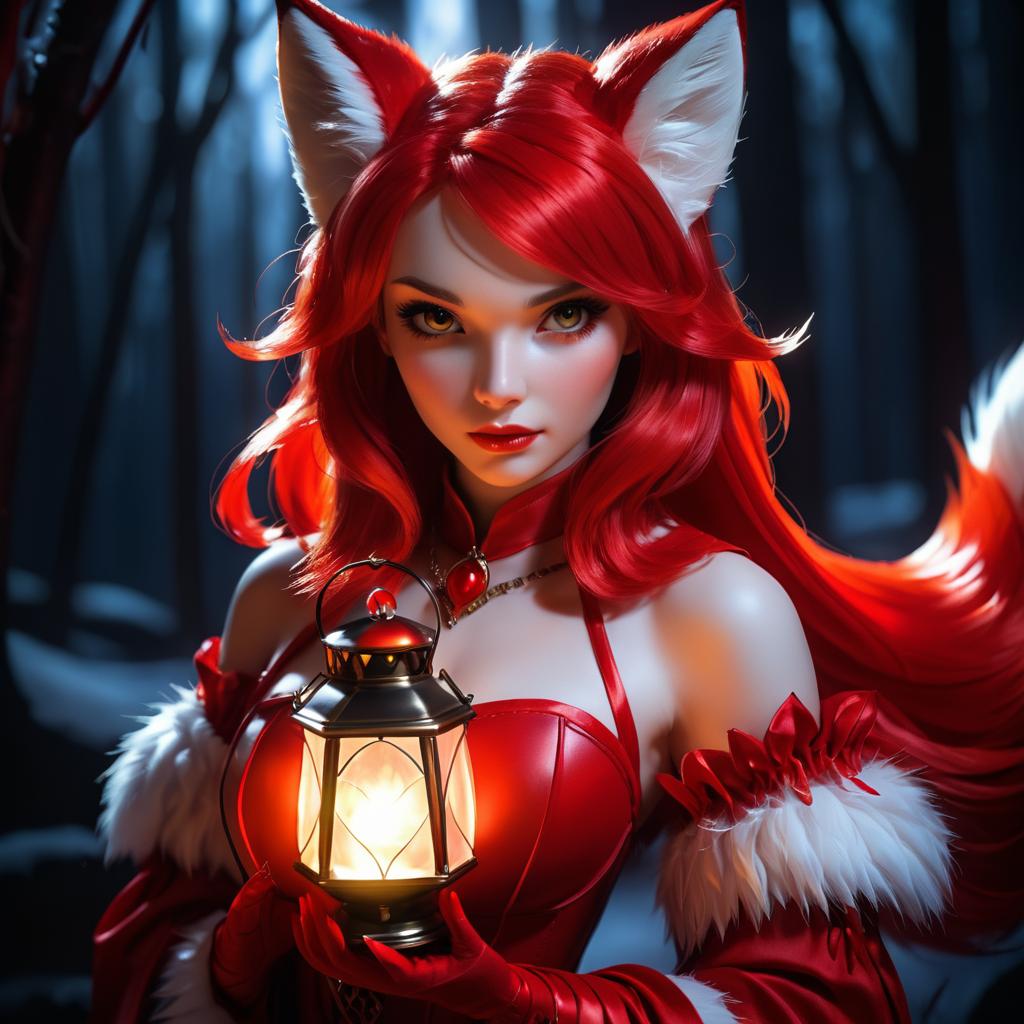 High-detail digital artwork of a beautiful fox-girl with vivid red fur and long red hair, dressed in a red corset and fur-trimmed cloak. She holds an ornate red lantern in one hand, standing in a dark, snowy forest under moonlight. The character has sharp blue eyes, fox ears, and a fantasy-inspired outfit with black gloves and intricate detailing.