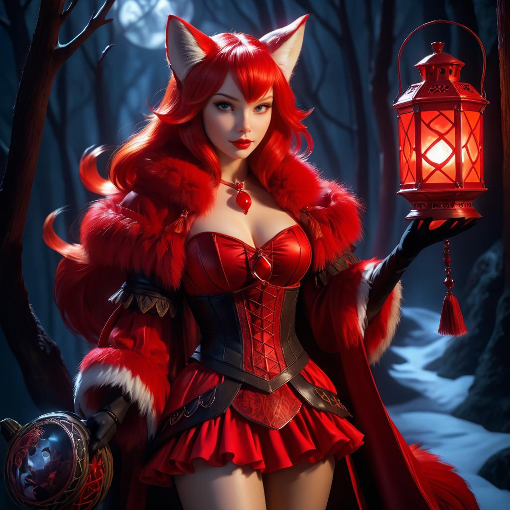 Beautiful fox-girl with red fur holding a lantern, set in a dark fantasy world. Styled in high detail by Artgerm.