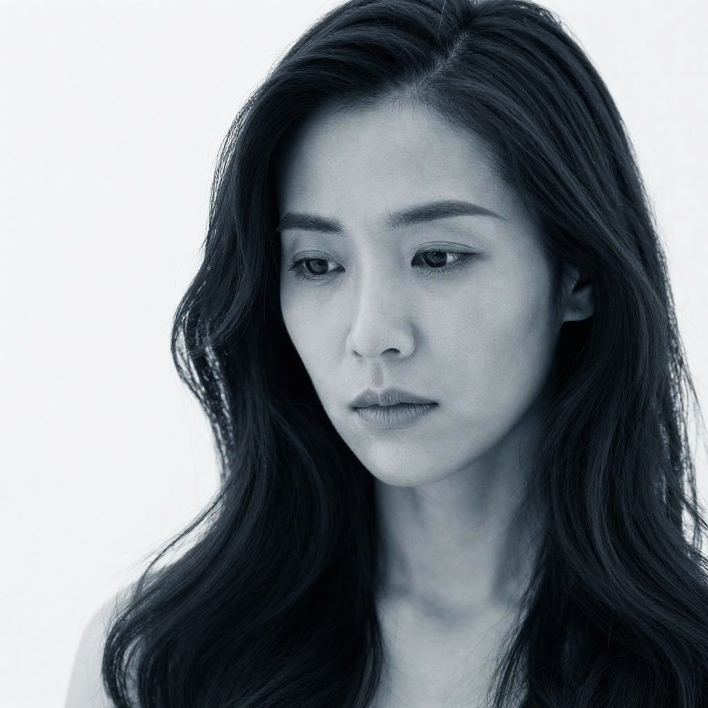Black-and-white photograph of a topless Asian woman with dark hair, holding a white towel in her right hand. She looks to the side with an open mouth, conveying a thoughtful or surprised expression. The background includes patterned curtains, framed pictures, and decorative wall art, suggesting an indoor setting.