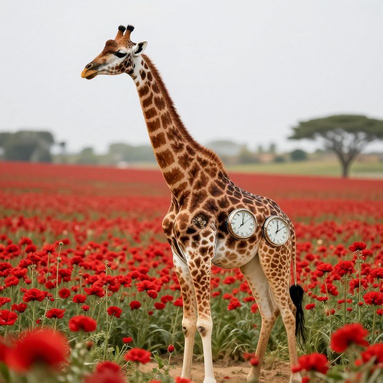 A surreal giraffe adorned with clock faces where its body meets its neck stands gracefully amidst a field of vibrant red flowers, defying the boundaries between nature and mechanical wonder.