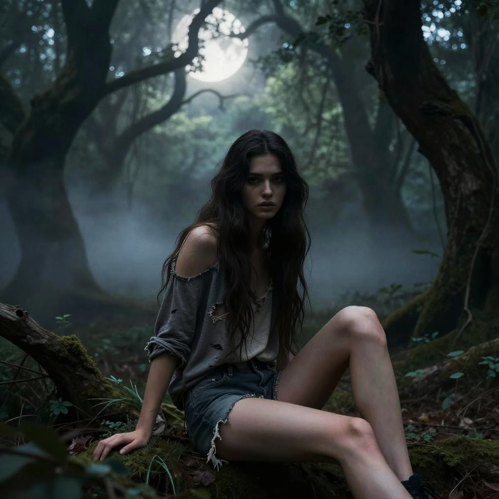 Photograph of a young woman with long brown hair, wearing a white crop top and frayed denim shorts, walking through a sunlit forest with sunlight