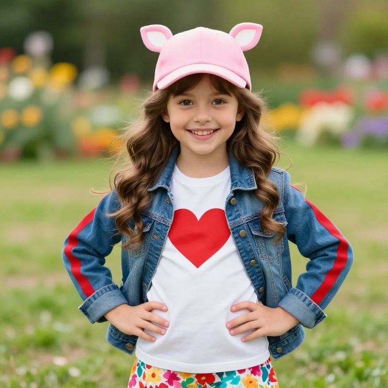 A cheerful young girl with long, wavy brown hair that flows gently over her shoulders, wearing a soft pink hat with cute animal ears, a white t-shirt featuring a large red heart in the center, and a blue denim jacket with bold red stripes on the sleeves. She is wearing bright, patterned floral shorts at the bottom, adding a playful touch to her outfit. She stands confidently with her hands on her hips, looking directly at the camera with a bright, friendly smile, her eyes sparkling with curiosity and joy. The scene is set in a sunny, open field with soft grass and a backdrop of a colorful garden, enhancing the lively and cheerful atmosphere.