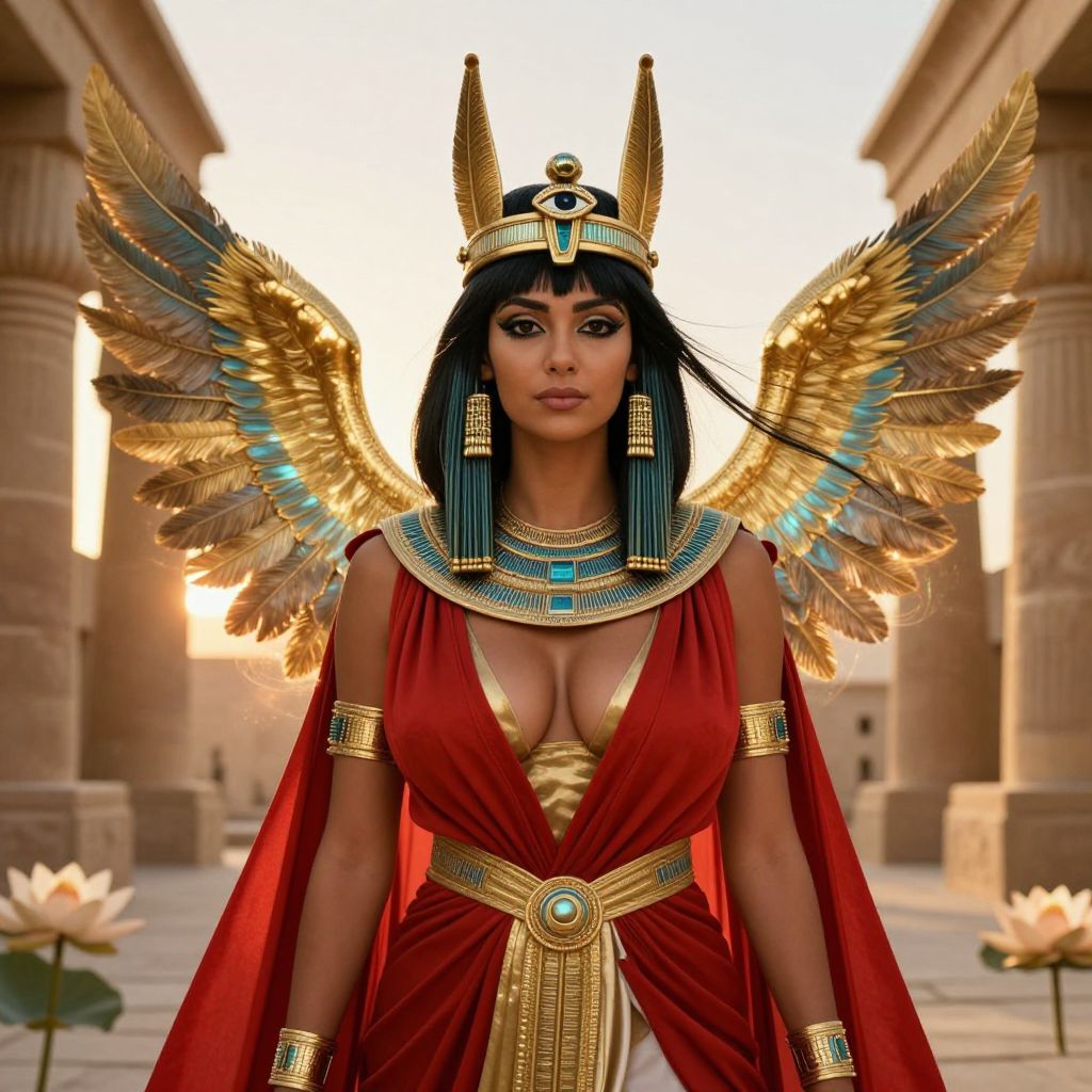 A realistic photorealistic portrait of a beautiful woman in a detailed Egyptian goddess Isis costume, wearing flowing red and gold robe with golden headdresses and eye makeup symbolizing the Eye of Horus, large mystical wings made of golden feathers spread out behind her, glowing softly with a faint blue and gold aura, standing in a sun-drenched ancient temple at sunset with lotus flowers and stone columns in the background, full face with serene, wise expression, deep brown eyes, smooth olive skin, and long black hair flowing in the wind.. The woman has big tits and cute face
