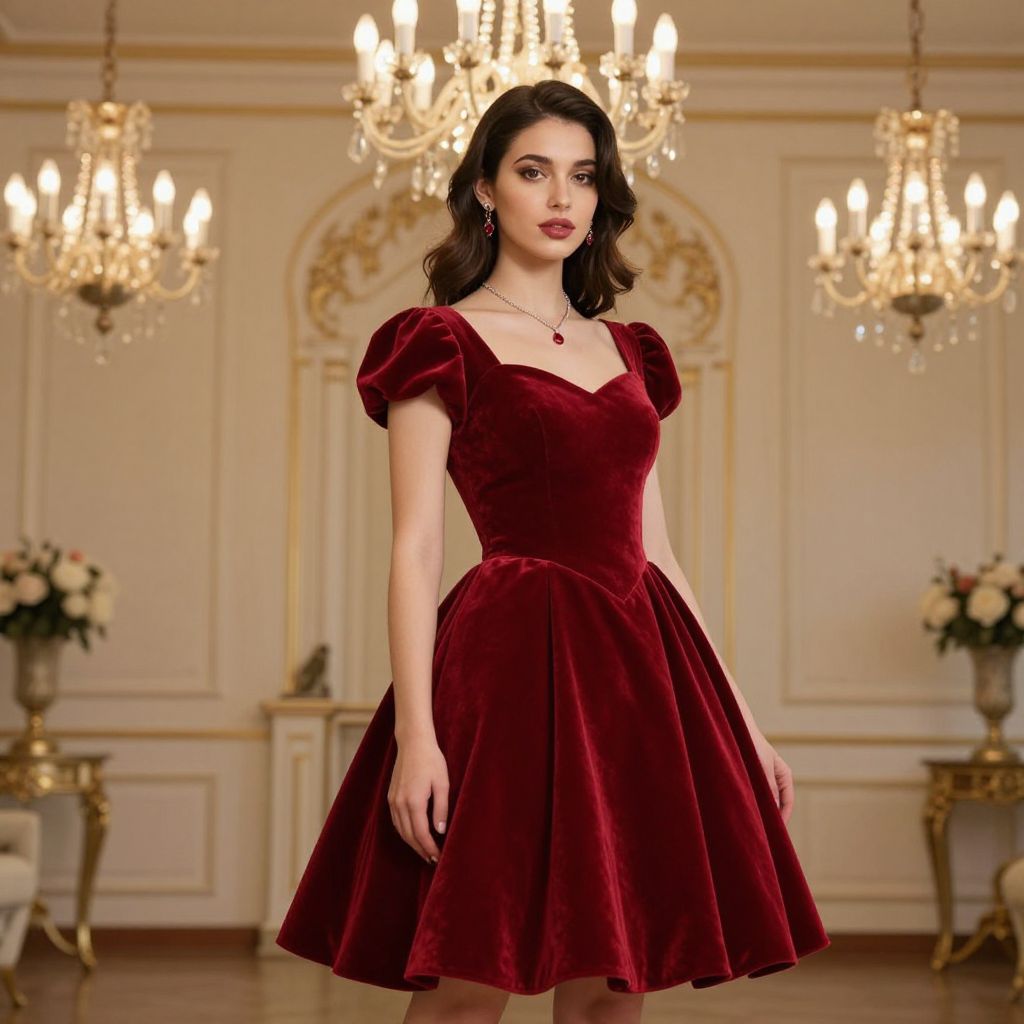 Velvet Princess Dress, a woman in a red dress standing in a room with chandeliers