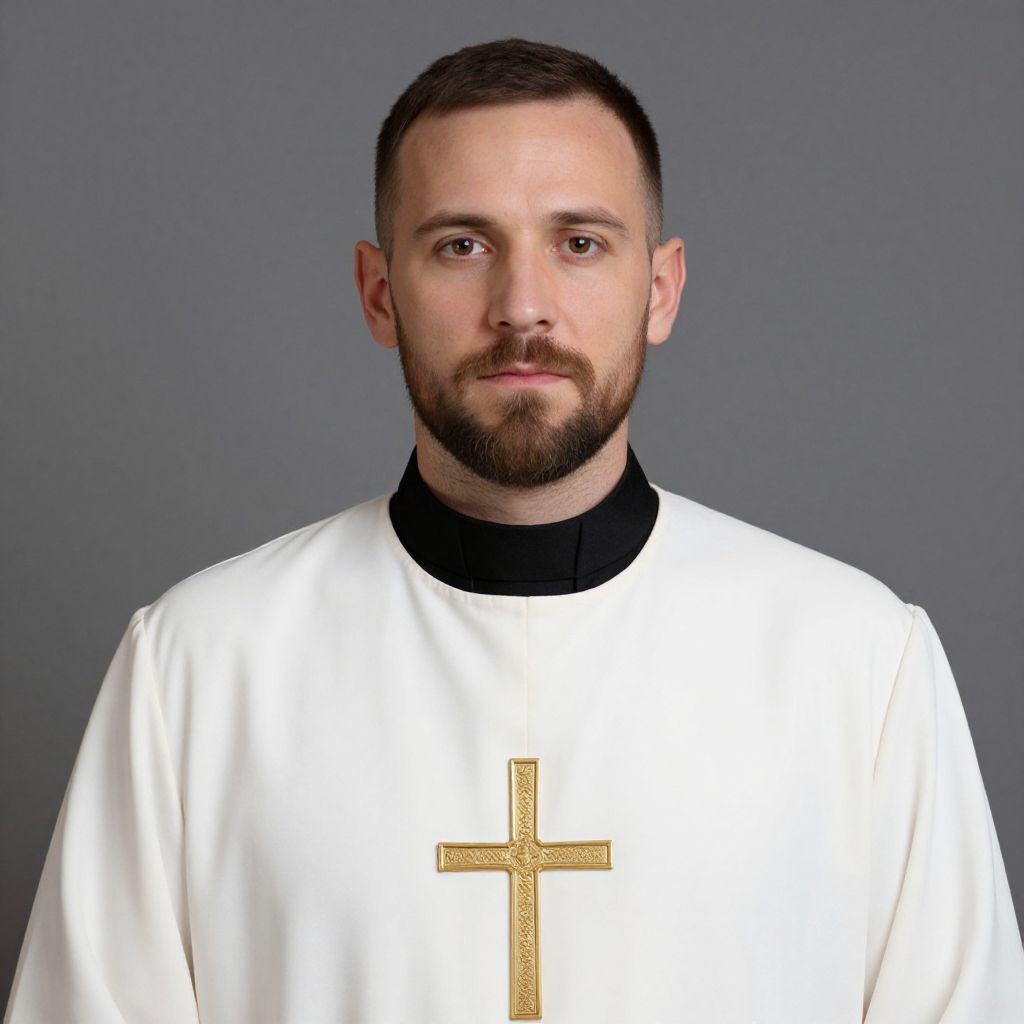 Man with short hair and beard wearing a white robe with a black collar and a gold cross on the front.