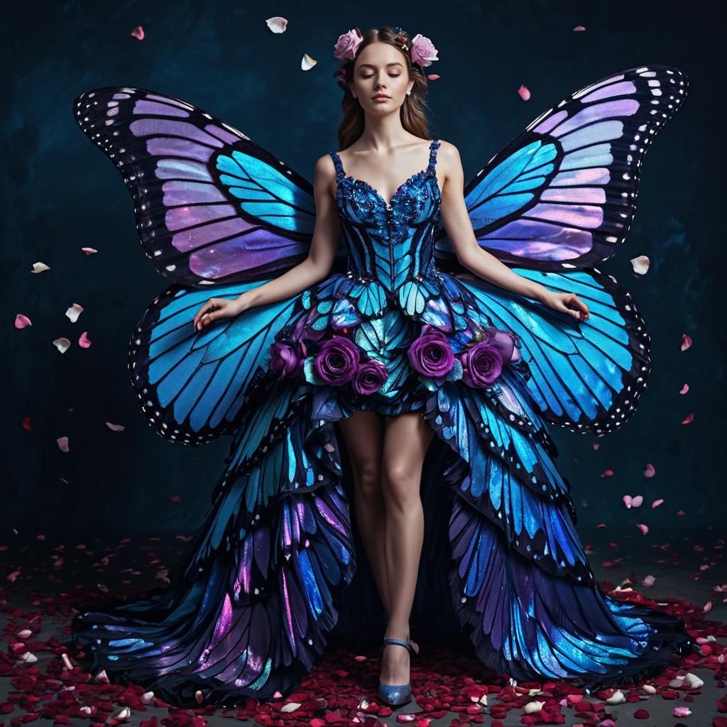 A full body photorealistic beautiful dress made entirely of butterfly wings with iridescent texture, blue and purple, worn on an ethereal Caucasian woman, ((rose)) fashion designed, influenced by rose petals, highly detailed, 8k sharp focus, photorealism
