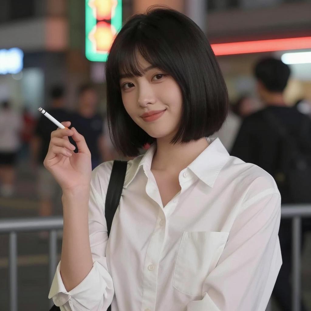 A young woman with fair skin, short brown bob haircut, and wide brown eyes. She holds a silver revolver with her right hand, positioned against the side of her head. Her lips are slightly parted, showing her teeth. The background is softly lit with a light, blurry effect.