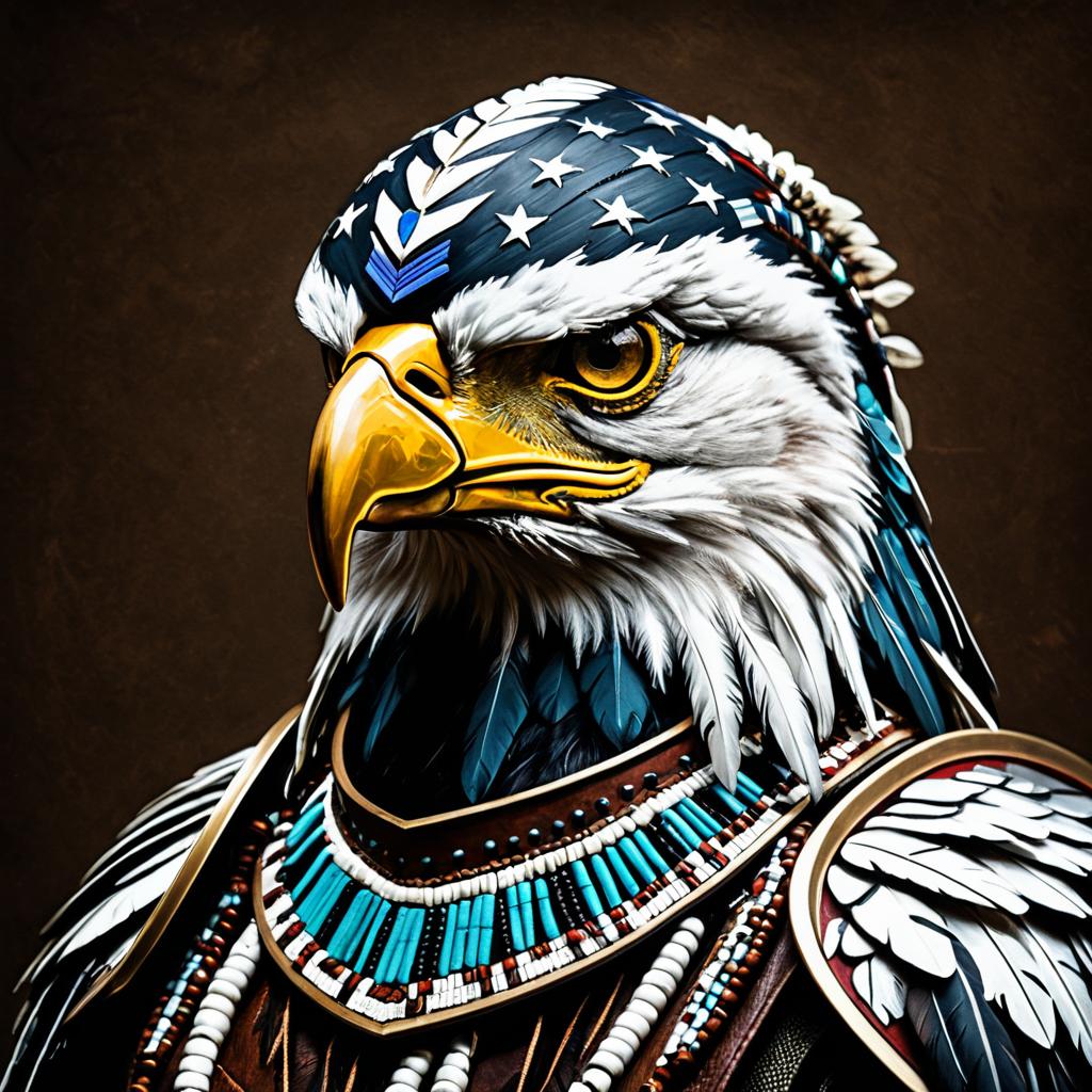 A high-quality digital painting of an American Eagle helmet inspired by USA's Halo armor. The helmet and armor plates are intricately adorned with detailed Native American beadwork in red, white, and turquoise colors. The eagle's golden beak and intense eye are featured prominently with soft natural ambient lighting highlighting the textures and craftsmanship.