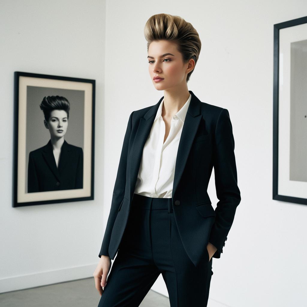 Slick Back hairstyle on fashion model, wearing tailored tuxedo, in glass hall, captured in fashion editorial style with shadow contrast.