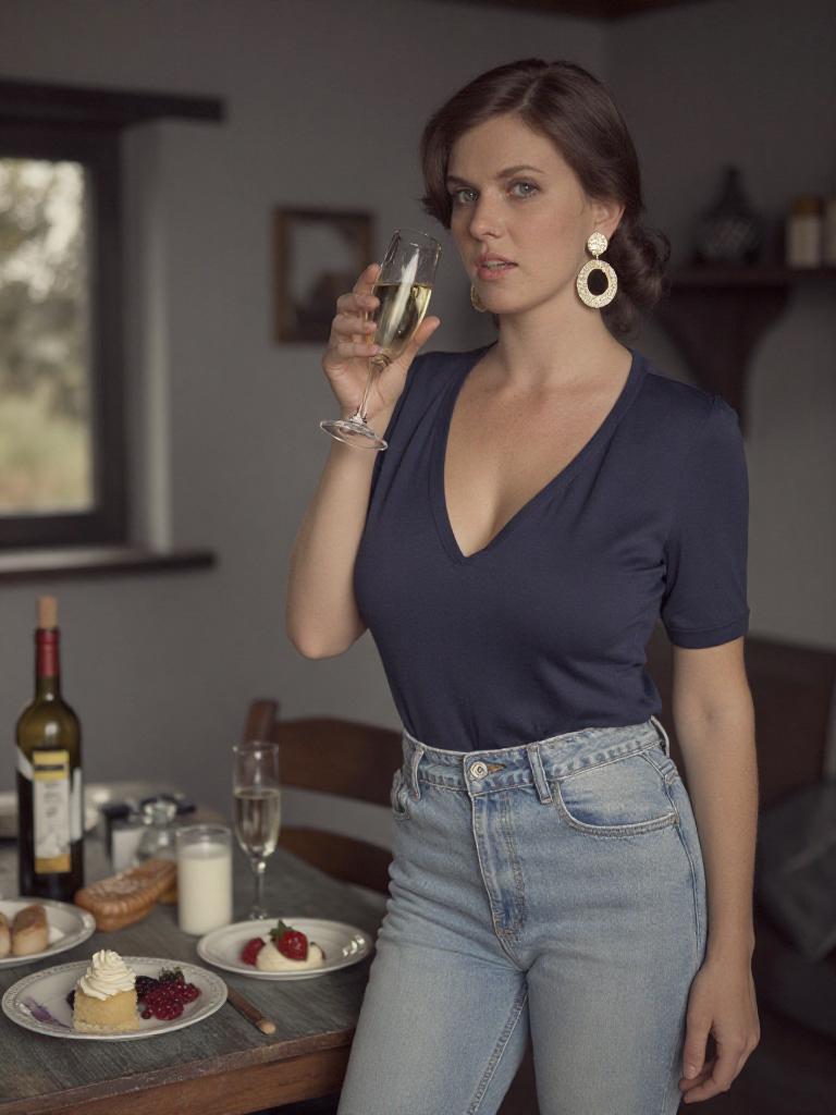 A petite woman in a navy blouse with a V-neck and light wash skinny jeans, large round earrings, captured in the soft, vintage tones of the Calotype process, enjoying a Champagne Morning Feast in a countryside cottage. Sexy. Pretty face and beаutiful eyes. Big breasts