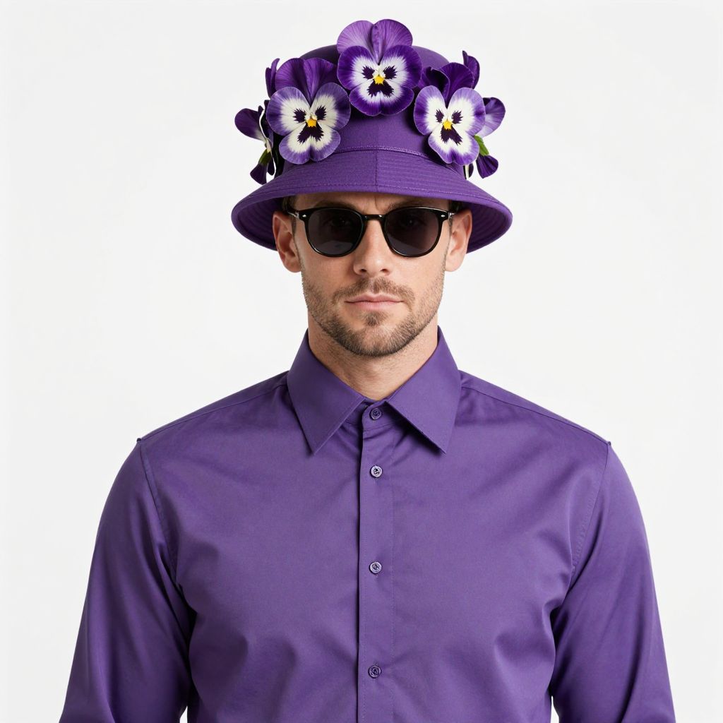 Purple Pansy Costume Adult, man in a purple shirt and purple hat with flowers