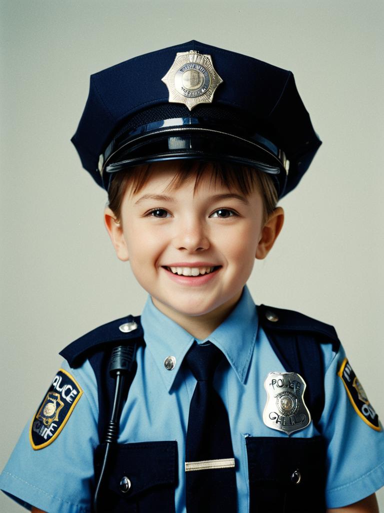 Child in Police Officer Costume, cinematic realism, cheerful portrait