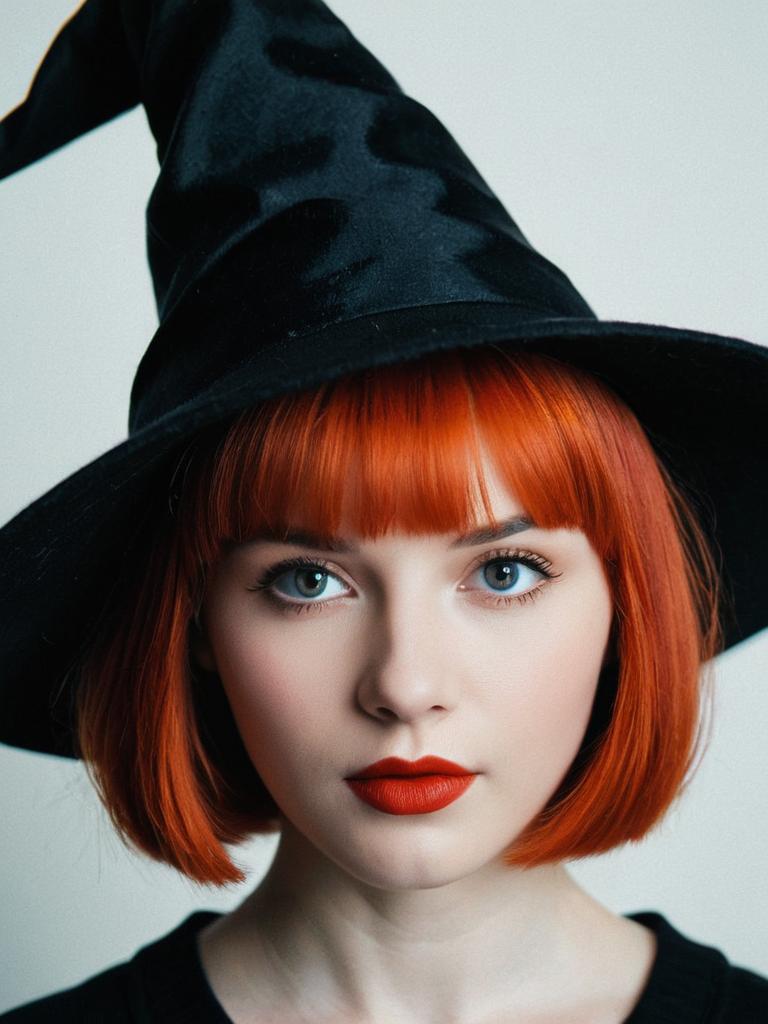 Portrait of a young woman with bright orange-red hair wearing a black witch hat with an orange ribbon. She has blunt bangs, red lipstick, and natural makeup, looking straight at the camera with a neutral expression. The subject is dressed in a black garment with a white collar visible, against a plain light background.