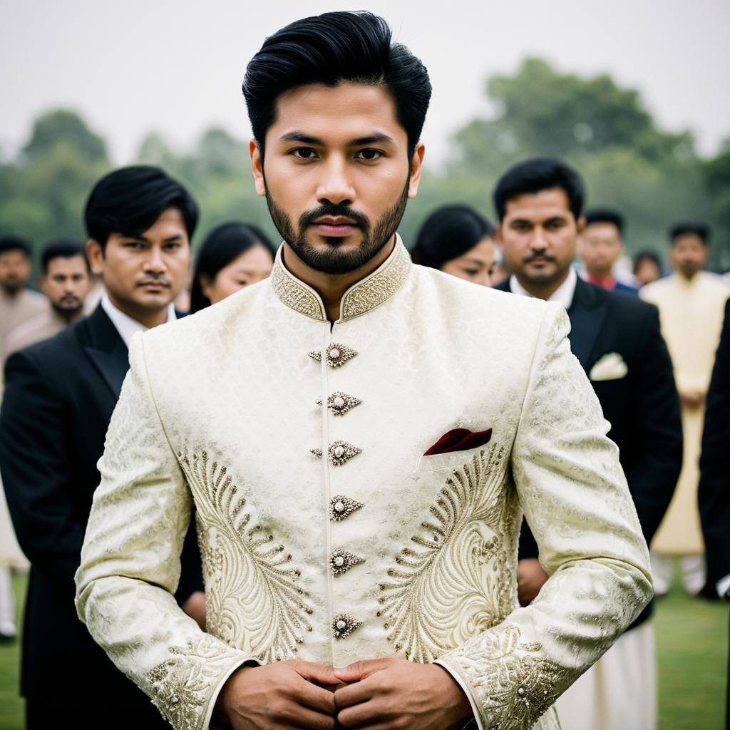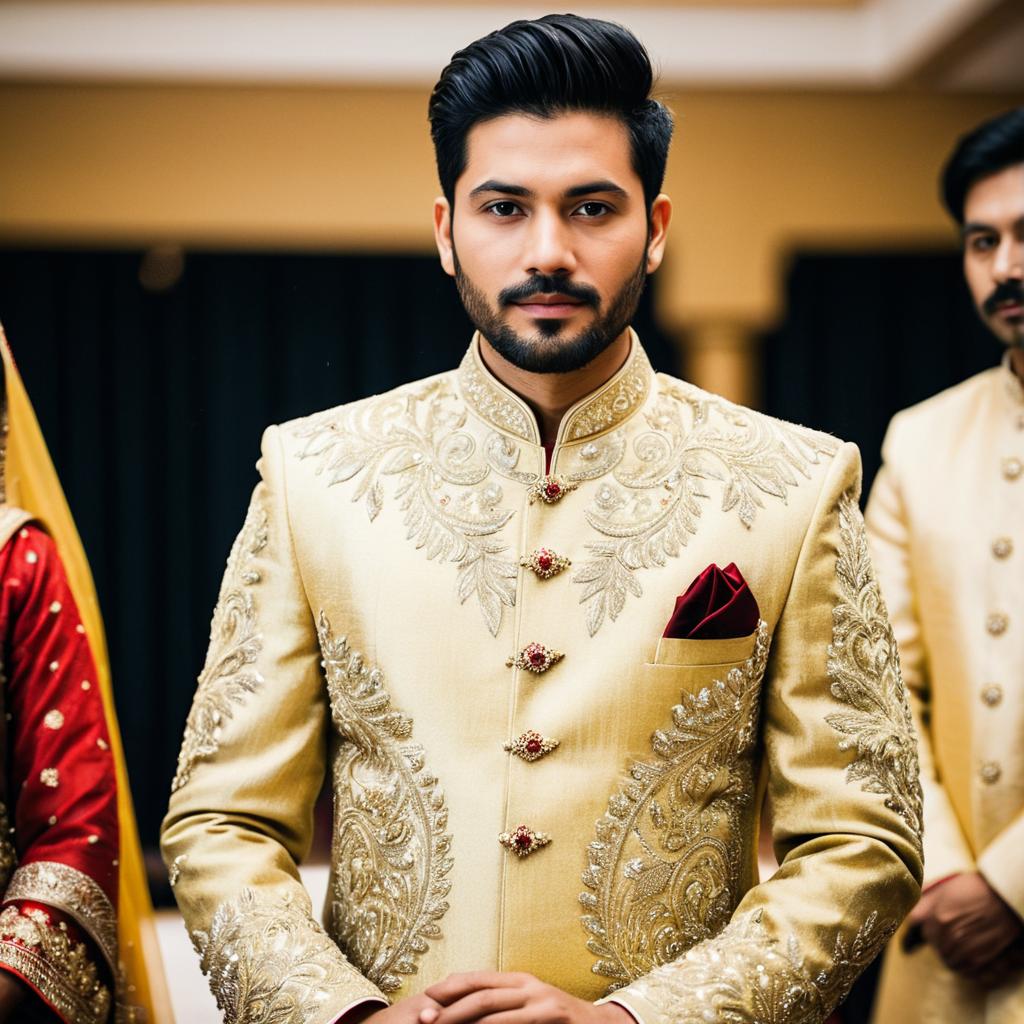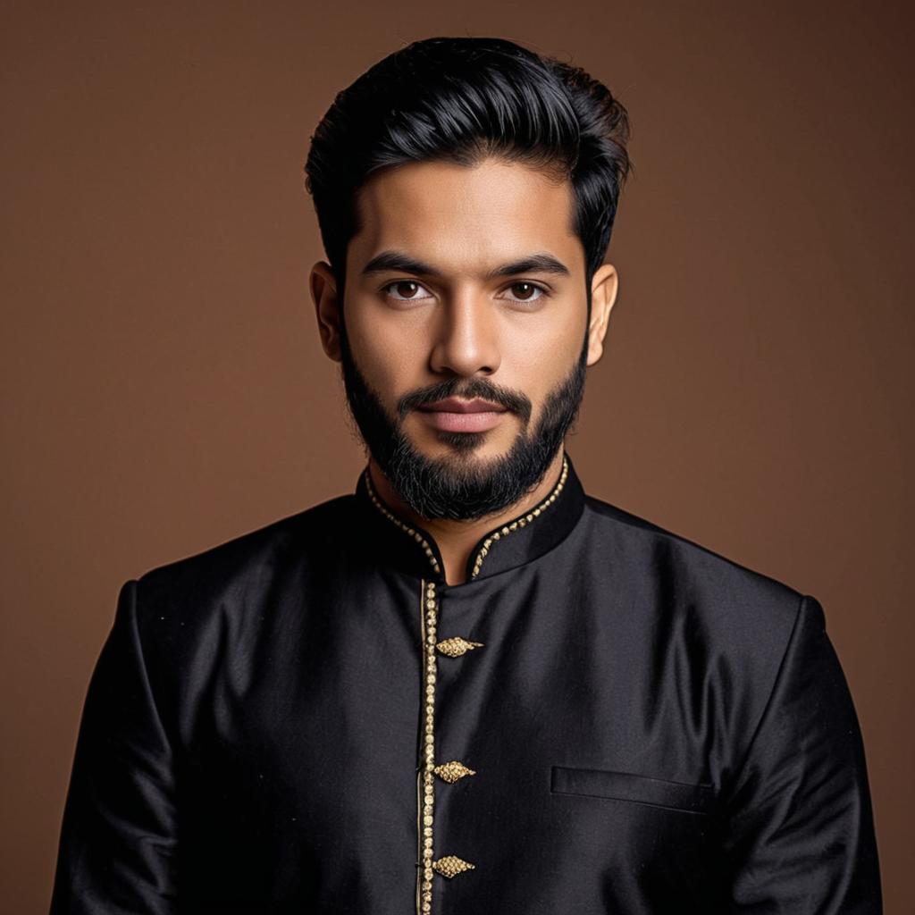 Groom mehendi outfit,1boy, male focus, solo, realistic, black hair, facial hair, own hands together, looking at viewer, asian, beard, long sleeves, standing, mustache