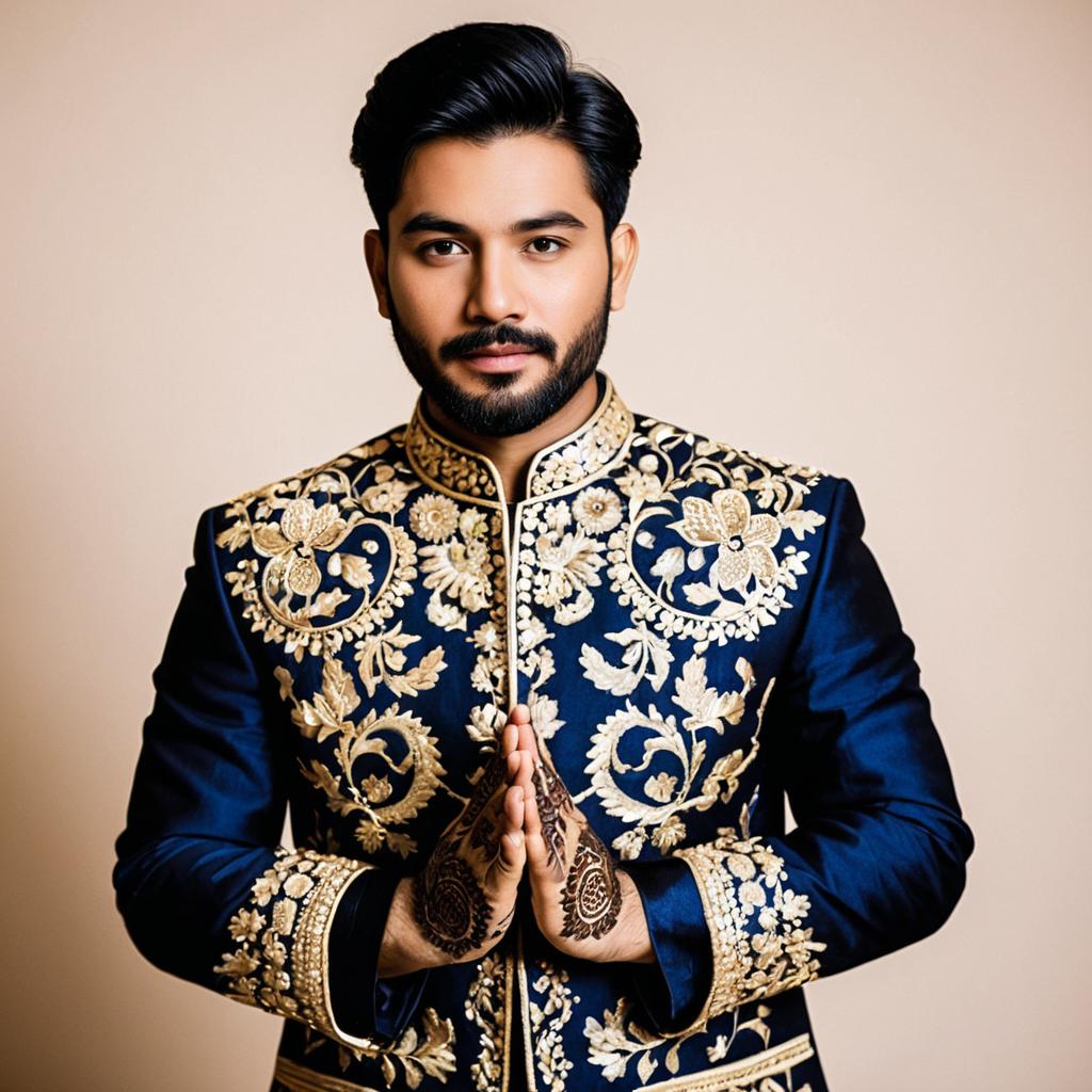 Portrait of an Asian man with black hair and beard wearing a traditional navy blue and gold embroidered mehendi outfit. He is standing with his hands together showing henna (mehendi) designs and looking directly at the camera. The outfit features detailed floral patterns with long sleeves and a high collar.