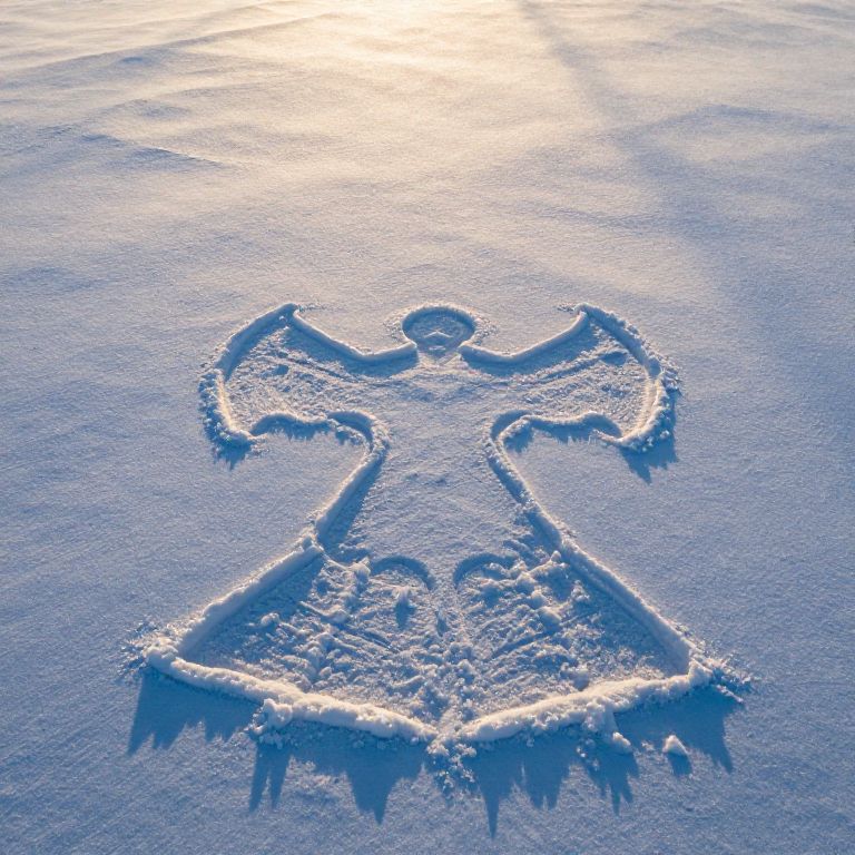 Snow angel images capturing an aerial view of multiple snow angels arranged symmetrically on a vast, sparkling snowfield under a golden sunrise, with long shadows and icy crystal textures enhancing the quiet beauty of the winter morning.
