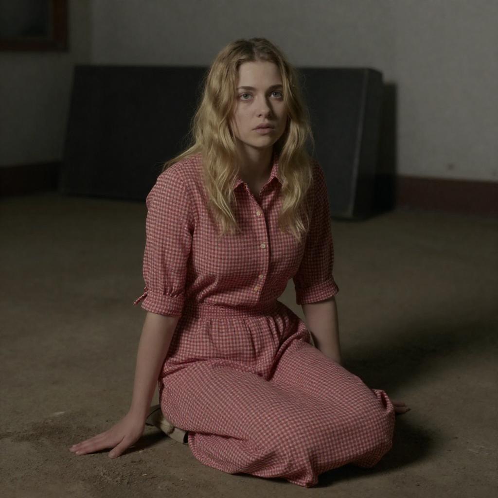 Woman with messy blonde hair, covered in red and blue paint, wearing a light green dress with blue straps. Background shows a blurred, misty outdoor setting with trees and indistinct objects. Paint smears on her face, arms, and chest. She stands with a neutral expression, slightly turned to the side.