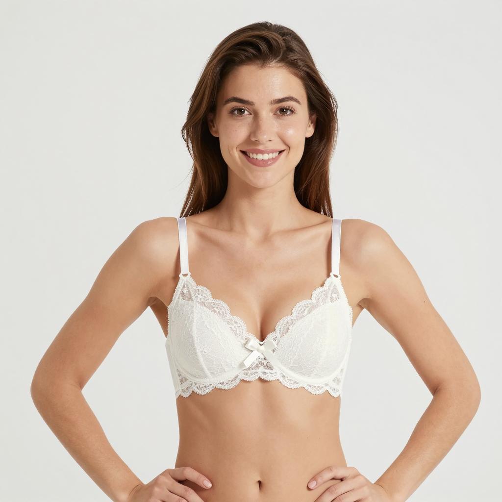 Woman with fair skin, brown straight hair, smiling, wearing white lace bra with bow center. Background is plain white. Bra covers medium-sized breasts. She stands facing camera, hands on hips. Simple studio lighting.