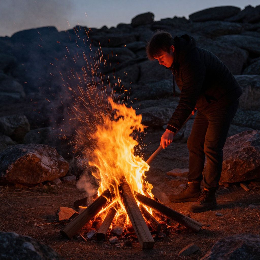Man tends to a blazing fire at dusk, using a wooden frame to stoke flames that cast vibrant orange hues and sparks against a rugged, rocky landscape.