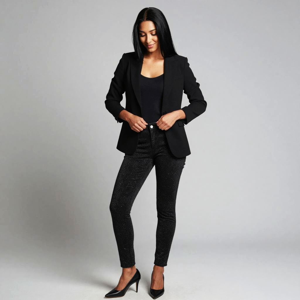 Photograph of a confident woman standing against a bright white background. She has dark hair pulled back and is wearing a black blazer over a black top, paired with black sequined pants that reflect light. She's standing with one hand on her hip and the other relaxed by her side, exuding a bold and stylish vibe. The image has a high-contrast, almost monochromatic look.