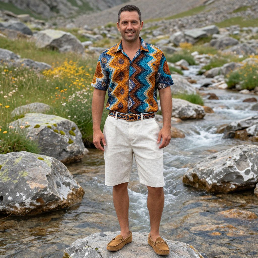 A man, batik-patterned short-sleeve shirt, soft hemp shorts, vibrant colors, woven belt, suede moccasins, relaxed fit, crystal-clear mountain stream, rocky outcrops, wildflower meadows, natural light, cheerful expression. Man has masculine face and piercing eyes