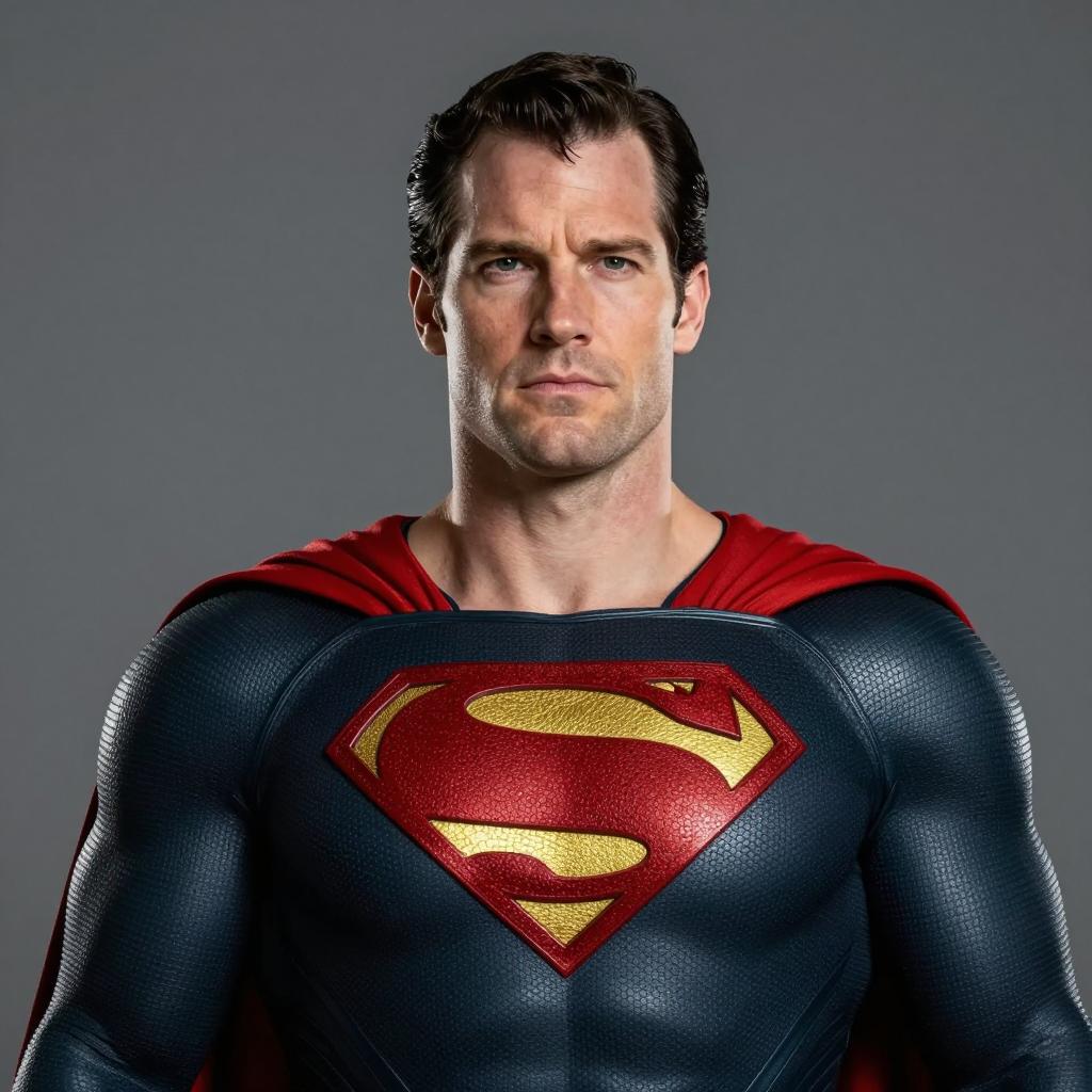 Adult superhero costume man, photorealistic, Henry Cavill as Superman, close-up, wearing full Superman costume, black and red suit, red cape, iconic Superman "S" emblem on chest, serious expression, short dark brown hair, strong jawline, muscular build, gray background, digital art, realistic ures, CGI, high detail, studio lighting, upper body shot, front view