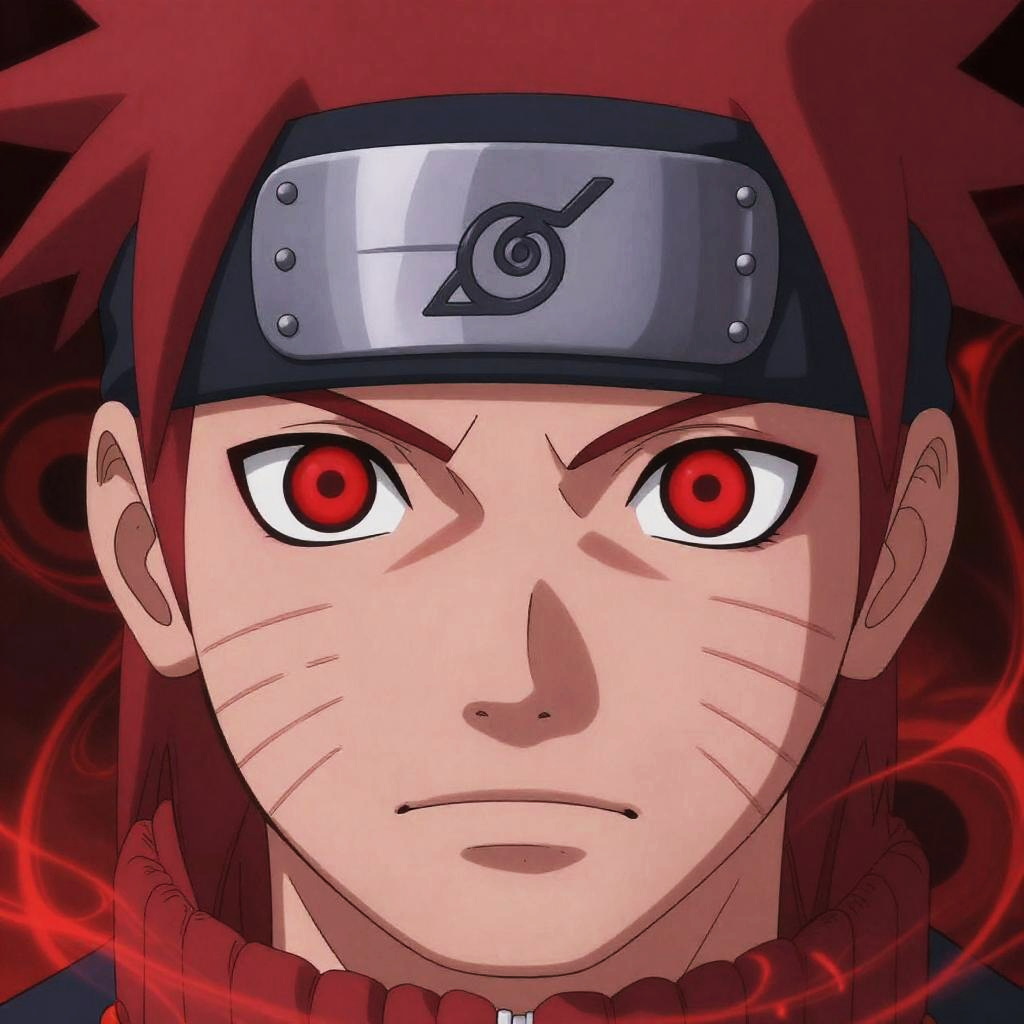 Close-up of red eye Naruto's face, intense red sclera and sharp pupils emitting light, subtle scars and detailed hair strands, mystical aura enveloping him, stylized background with abstract red patterns, strong emphasis on emotion and power.