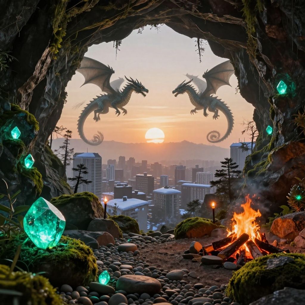 Fantasy cave entrance at sunset, two dragon silhouettes, glowing crystals, roaring fire, cityscape in background, digital art.