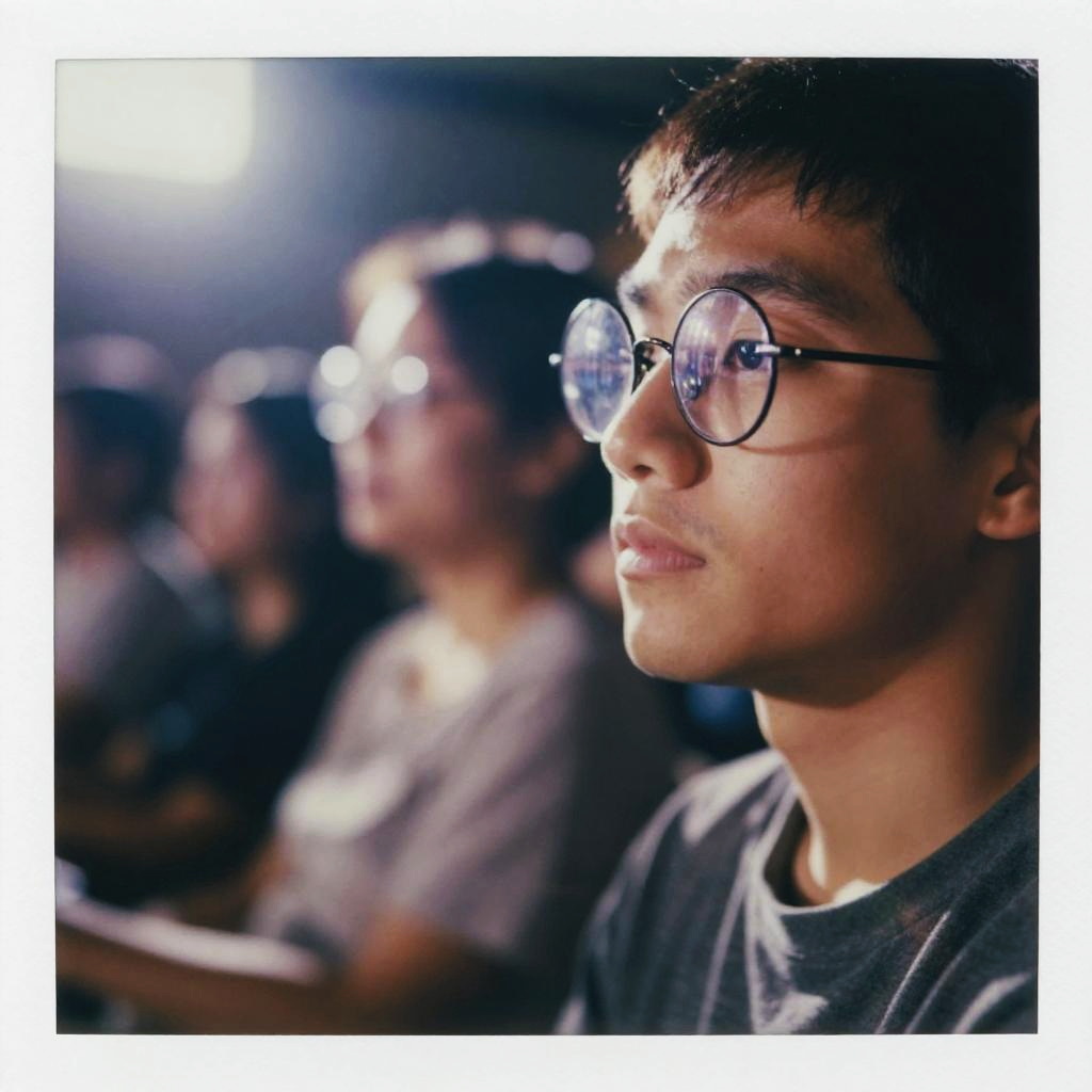 Photograph of a young Asian man with short black hair and round, thin-rimmed glasses, focused intently to the right. He has a light olive skin tone and wears a gray t-shirt. The background is blurred, showing several other individuals with similar features and attire, also wearing glasses, sitting in a dimly lit room. A bright light source is visible in the top left corner, casting a soft glow on the subjects' faces. The image has a shallow depth of field, highlighting the man in the foreground.