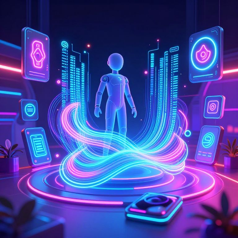 Neon-lit digital CGI image of a humanoid robot centered on a glowing, circular platform. Surrounding the robot are floating, neon icons (including a phone, camera, and gear) emitting blue, pink, and purple light. Bright, swirling lines of light in blue and pink curl around the robot, creating a futuristic, sci-fi ambiance. The background is dark with subtle neon strips. Potted plants are visible at the bottom corners, adding a touch of greenery to the high-tech setting. The overall style is vibrant and futuristic, emphasizing technology and digital interfaces.