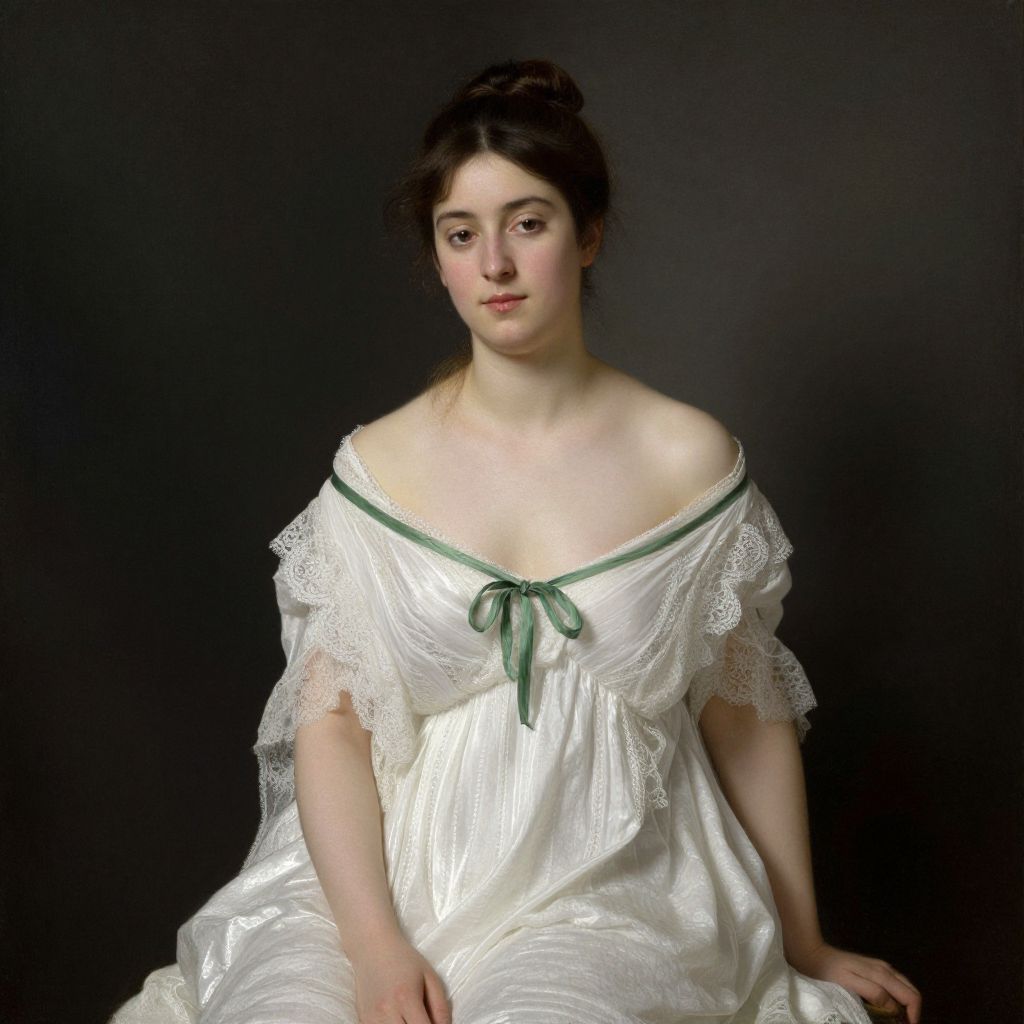 This is a classical oil painting of a young woman with fair skin and dark brown hair, styled in an updo. She wears an off-the-shoulder, white satin dress with delicate lace trim and a green ribbon tied at the neckline. Her expression is calm and slightly serious. She is seated against a dark, solid background, with her right hand resting on a wooden surface. The lighting highlights the smooth texture of the satin and the intricate lace patterns, creating a soft, elegant contrast with the dark background.