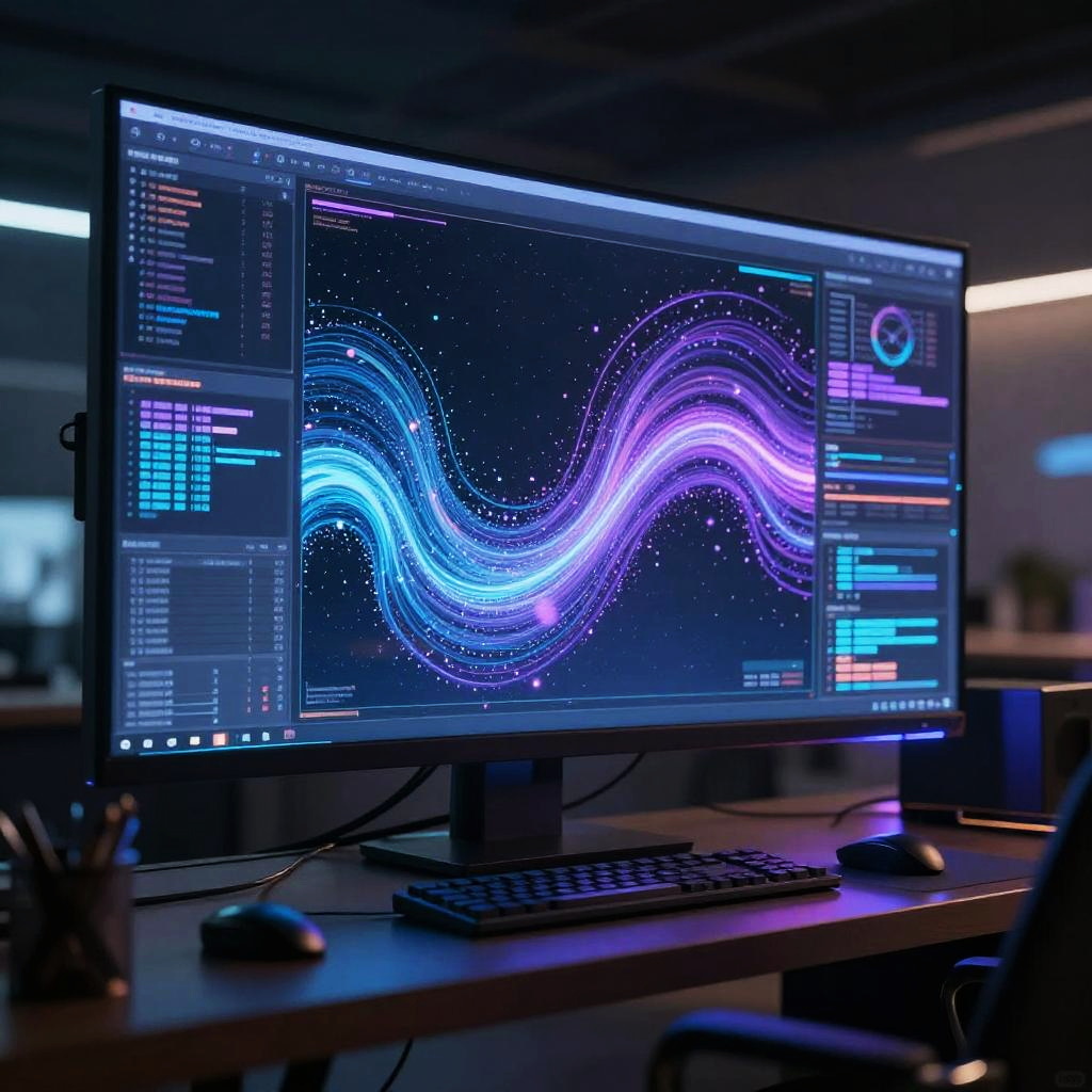 AI graphics generator visualizing a digital artist workspace, holographic screens filled with complex AI data, streams of flowing particles in vivid blues and purples, tech-savvy environment, subtle reflections and light refractions, high-resolution concept art style.