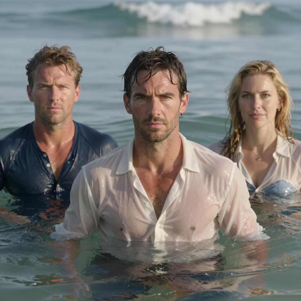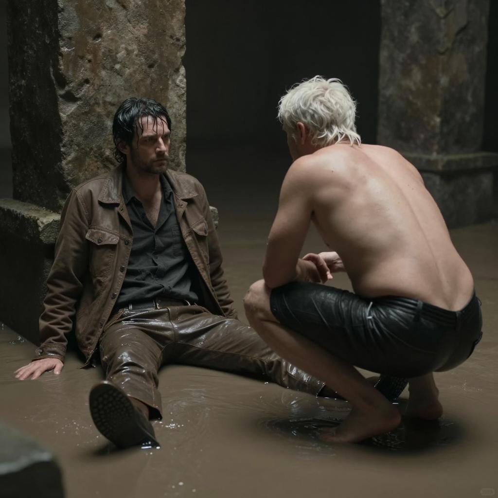Two men in a dimly lit, flooded room with a muddy floor and large stone pillars. One man with dark wet hair, wearing a brown jacket and pants, sits on the floor with legs spread, looking serious. The other man, with white hair, shirtless and wearing black shorts, crouches facing the first man. The atmosphere is tense and the setting appears to be an old stone structure partially submerged in water.