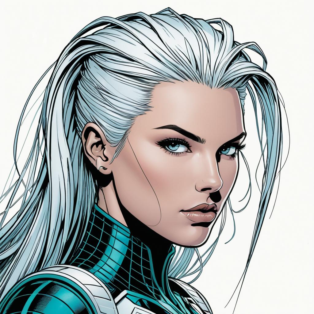 Modern comic book image in the style of Jim Lee depicting a tall, muscular woman in her twenties with long black hair, full lips, and striking green eyes that exude strength and determination. The character is fierce and drawn with sharp, clean lines and high attention to facial details. Set against a simple white background to emphasize the character, with dynamic shading and bold colors to capture the intensity and modern comic book aesthetic.