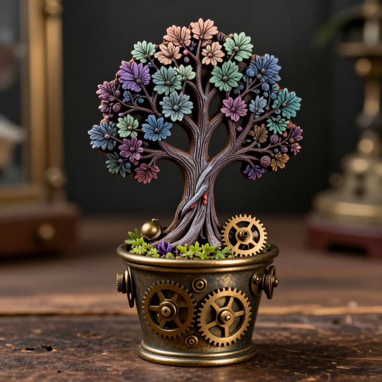 A small ornamental tree designed with a feywild theme, featuring colorful flower-like leaves in pastel shades. The tree is placed in a steampunk-style metallic pot decorated with intricate brass gears and mechanical details. The pot has a vintage, industrial look, complementing the magical and mystical aesthetic of the tree. The background is softly blurred, emphasizing the detailed craftsmanship of the steampunk potted plant.