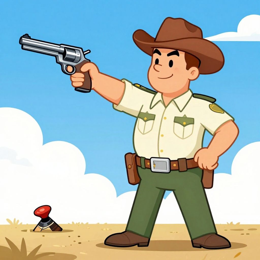 Cartoon cowboy in blue vest, white shirt, red tie, brown boots, and white hat, holding holster, stands in sunny Western town.