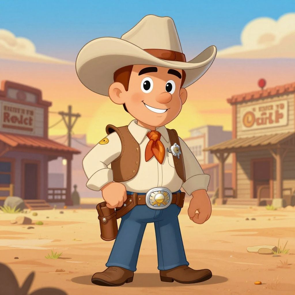 Cartoon sheriff standing proudly in a dusty western town, wearing a wide-brimmed hat and shiny badge, with a friendly smile and colorful background, vibrant and detailed