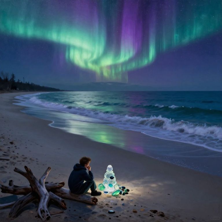 Photograph of a serene night scene featuring a person with short dark hair, wearing a dark jacket, sitting at a wooden picnic table in a sunflower field. The table is adorned with a yellow box, a small clock, and sunflowers. The background showcases a vivid aurora borealis in green and purple hues, illuminating the starry night sky. Surrounding the sunflower field are trees with autumn foliage. The setting is peaceful, with the person gazing at the mesmerizing aurora, creating a tranquil and dreamy atmosphere.