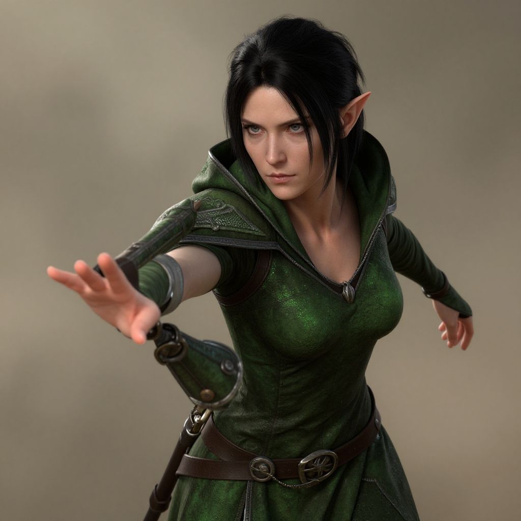 Female elven Rogue Moving with stealth and grace, green elven tunic, Savior, Average Height, Muscular, Round Face, pale Skin, (black Hair:1.5), grey Eyes, Narrow Nose, Thin Lips, Sharp Chin, Ducktail, ShortWilhelm Kotarbi├Е┬Дski, natural, shimmering, vibrant, gothic, rpg, 1400ad, ultra detailed, detailed, immersive, reminiscent of high fantasy RPG games, HD, masterpiece, best quality, hyper detailed, super realistic, perfect face, perfect hands, award-winning, professional, breathtaking, linquiveracloudy Prairiedusty weatherprofessional 3d model . octane render, highly detailed, volumetric