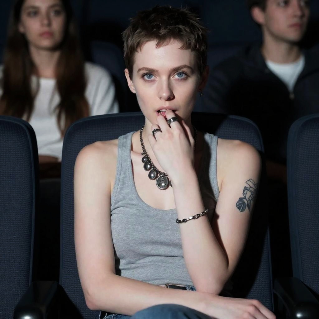 Short-haired woman with pale skin, blue eyes, and tattoos on her left arm, wearing a gray tank top and large necklace, sits in a blue and gray patterned theater seat, biting her finger, looking slightly to the side with a neutral expression. Other partially visible people sit behind her. Dark lighting. Jewelry includes a ring and bracelet.