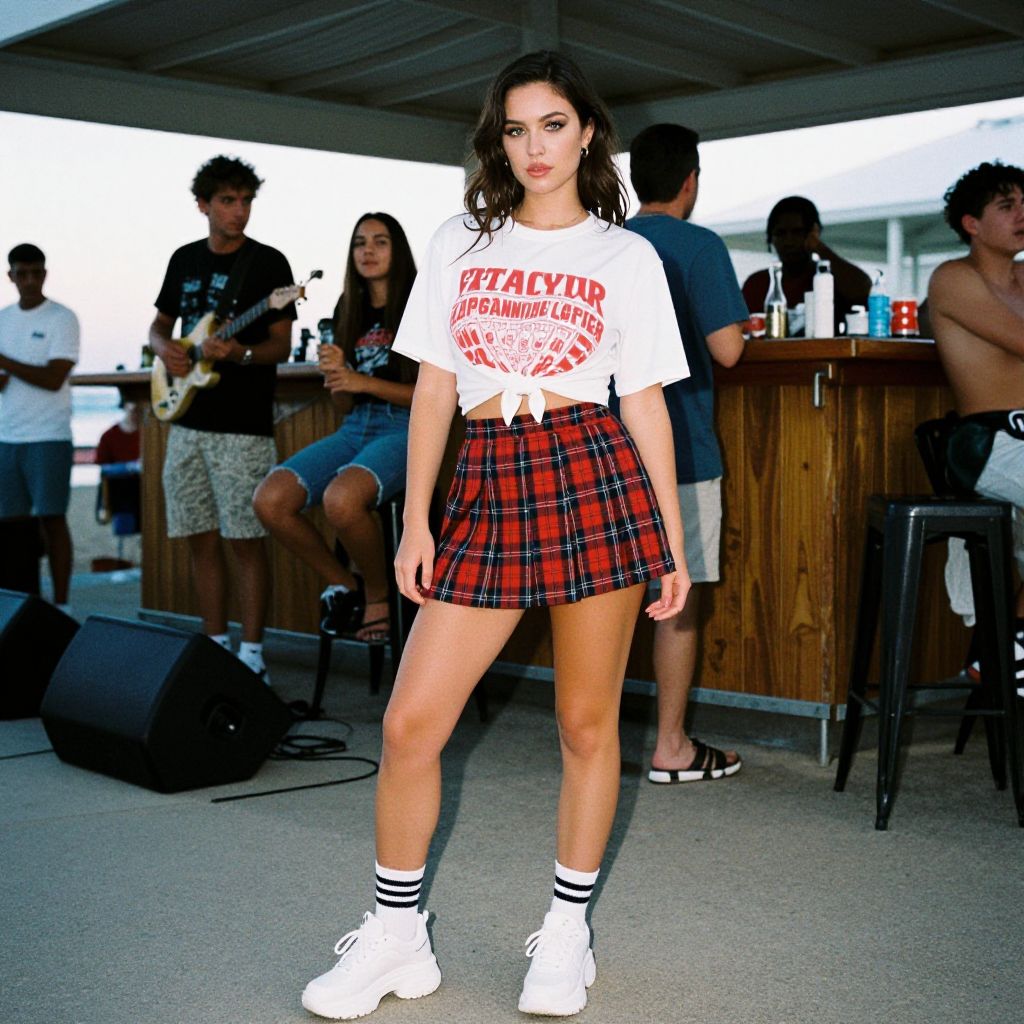 A Petite woman, styled in technicolor analog film stock, wearing a white graphic tee with red print tied at the waist, paired with a red and black tartan mini skirt, complemented by chunky white sneakers and white crew socks with black stripes, standing at a beach bar with live music. Sexy. Pretty face and beаutiful eyes. Big breasts